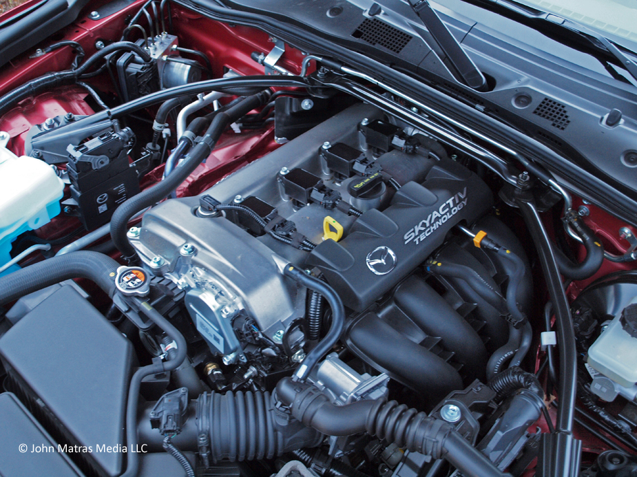 Compared to third generation, the engine is down on power, from 167 horses to 155. Torque however increased to 148 lb-f from 140, with the torque peak occurring at 4600 rpm instead of 5000 rpm. Instead of racing to the highest engine revs possible, the new Miata gets more twist at lower, if not exactly stump-pulling rpm, that combined with the weight, gives more acceleration at more moderate engine speeds, which means more performance without having to constantly keep with revs up, which can be tiring on the road.