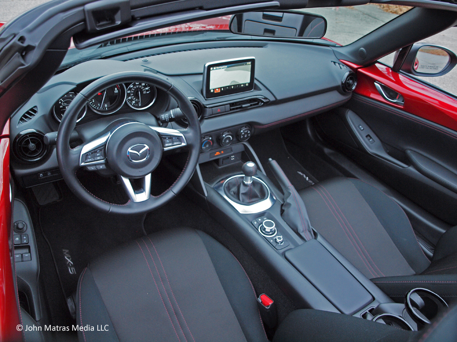 Seats, even on the base trim, are well bolstered, deserving the designation sport seats, without being annoying in everyday usage while still more than adequate for track day. Seats for the $24,915 base trim level—Mazda calls it “Sport”—are finished in black cloth while the mid-level Club we tested has black cloth with contrasting red stitching. The Grand Touring Miata is available black or “sport tan” leather seating.